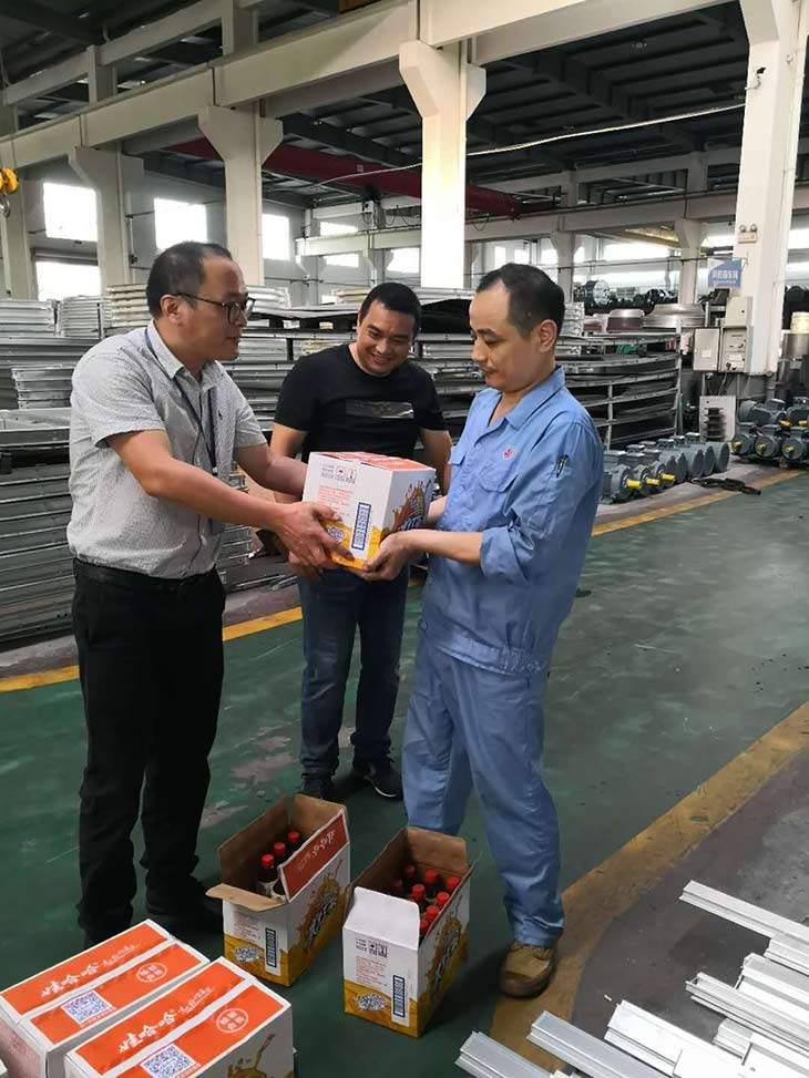 8月22日下午3时,阳光炙烤着大地,空气闷热犹如“蒸笼”,公司制造部依然热火朝天,紧张有序忙碌的工作着,赶着一批又一批的订单。公司总经理童海标带领各部门负责人来到车间一线,为炎炎夏日奋斗在一线岗位的员工送上了夏令用品和冰红茶饮料,总经理对不畏高温,坚守岗位一线的员工表示感谢,深情的向大家道一声“大家辛苦了”,并叮嘱制造部要重视防暑降温工作,给一线员工提供良好的工作环境,要求后勤部加大采购冰块数量以更有效降低车间气温。