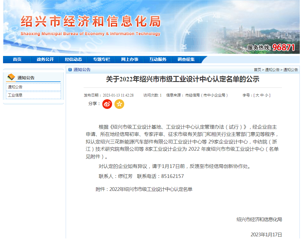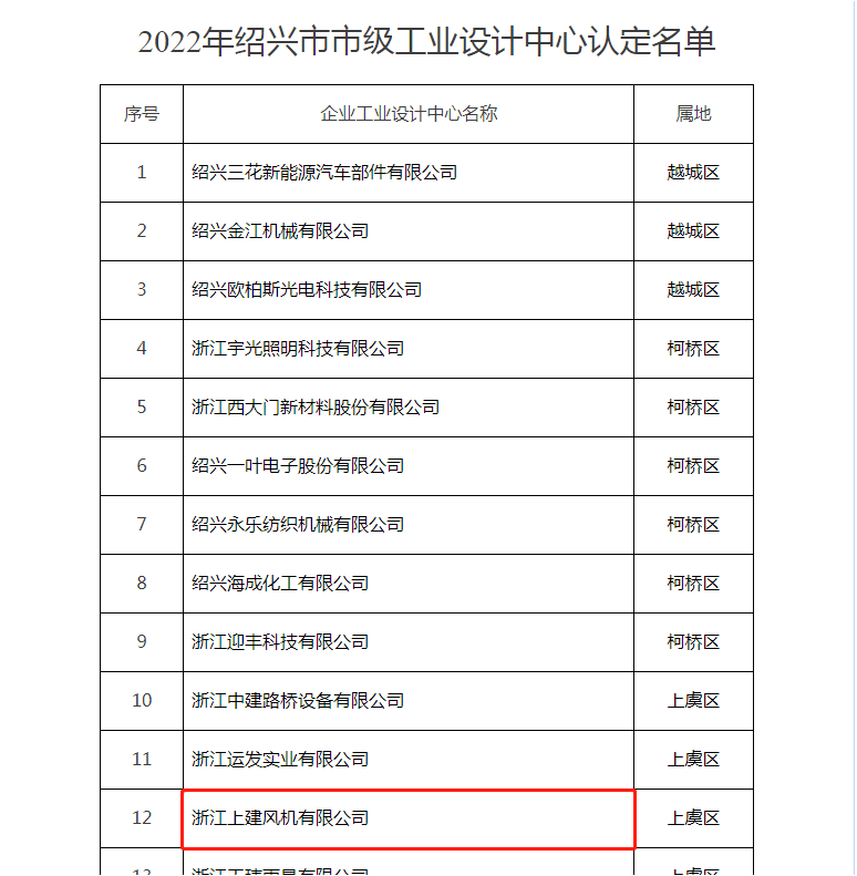 近日我司喜报连连,继公司获得浙江省“专精特新”中小企业称号之后,在绍兴市经济和信息化局官网上公布的《关于2022年绍兴市市级工业设计中心认定名单的公示》里,平博pinnacle平台风机的名字又赫然在列!
